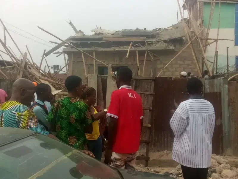 Many construction workers were on Tuesday trapped, while several others sustained varying degrees of injuries after a two-storey building under construction collapsed along the busy Oyemekun...