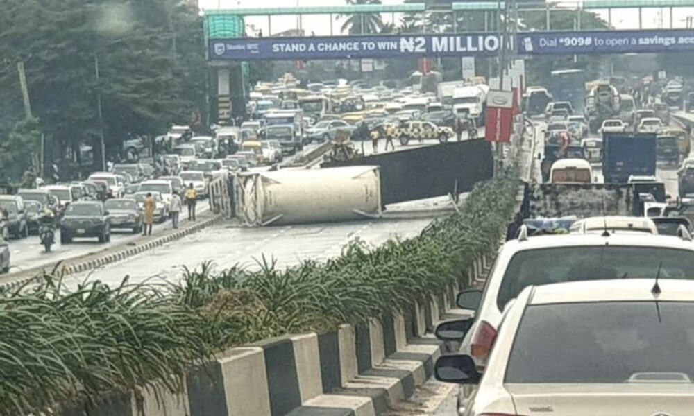 Officials of the Lagos State Traffic Management Authority (LASTMA) have recovered a gas tanker that fell along a major road in Lagos on Monday, causing heavy...