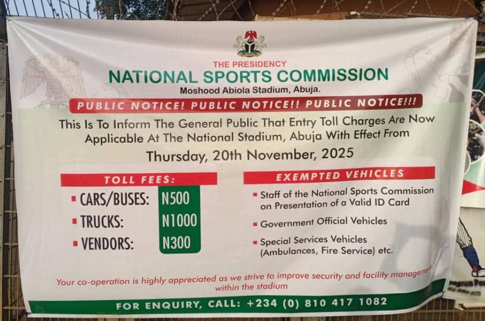 The notice, displayed prominently on a large banner at the stadium gate, read: “PUBLIC NOTICE! PUBLIC NOTICE!! PUBLIC NOTICE!!! This Is To Inform The General Public That Entry Toll Charges Are Now Applicable At The National Stadium, Abuja With Effect From Monday, 24th November, 2025.”